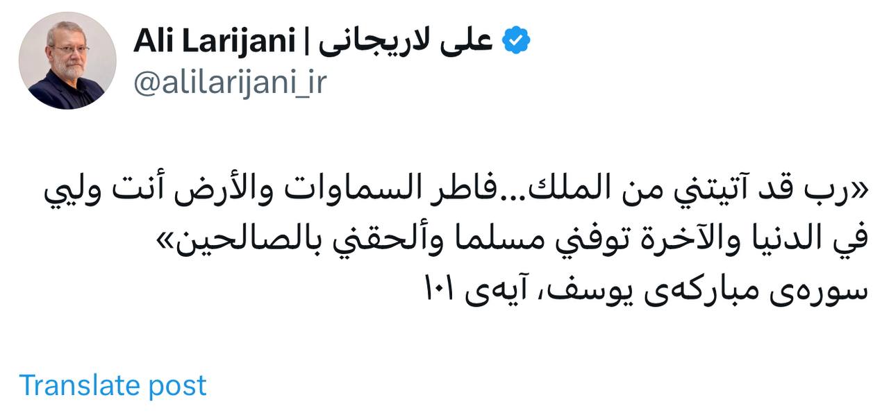 🔹علی لاریجانی در اولین پیام خود بعد از انتصاب به عنوان دبیر شورای عالی امنیت ملی در شبکه اجتماعی ایکس، آیه ۱۰۱ سوره یوسف (ع) را منتشر کرد.