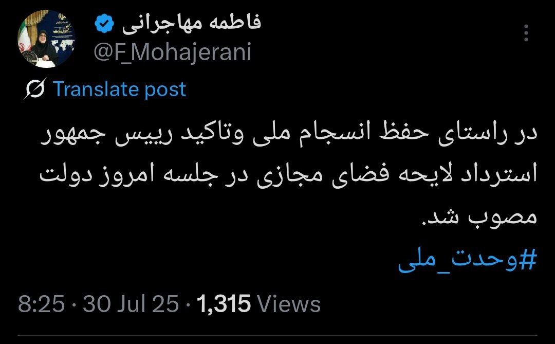 🔹سخنگوی دولت: در راستای حفظ انسجام ملی وتاکید رییس جمهور استرداد لایحه فضای مجازی در جلسه امروز دولت مصوب شد.