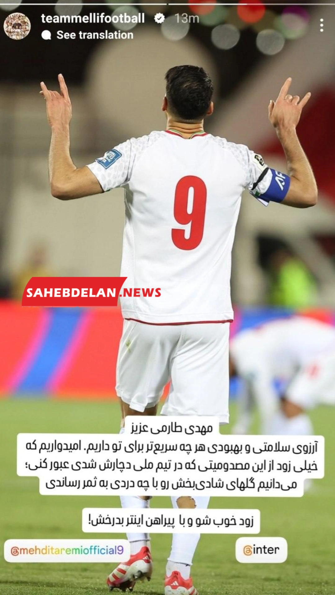 🔹صفحهٔ رسمی تیم ملی کشورمان با انتشار تصویری از مهدی طارمی، برای مهاجم اینتر آرزوی سلامتی کرد.