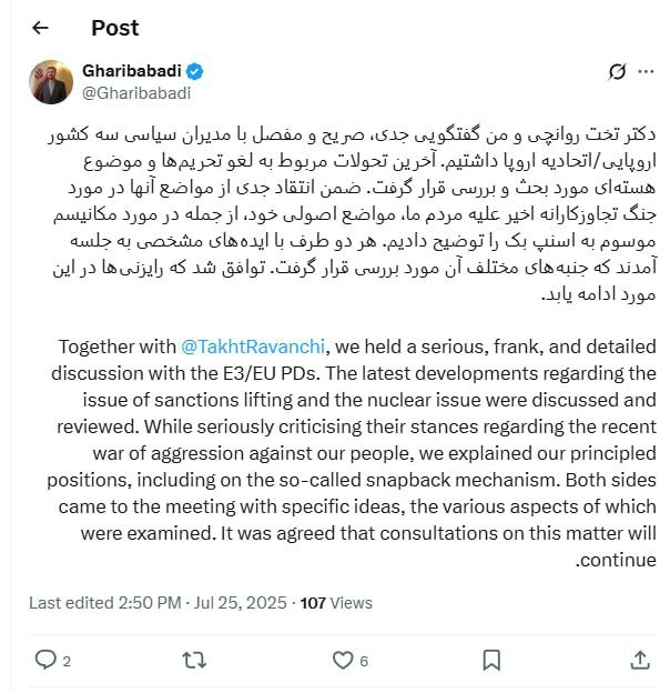 غریبآبادی: مذاکرات با اروپا صریح و مفصل بود/ توافق شد رایزنیها ادامه یابد