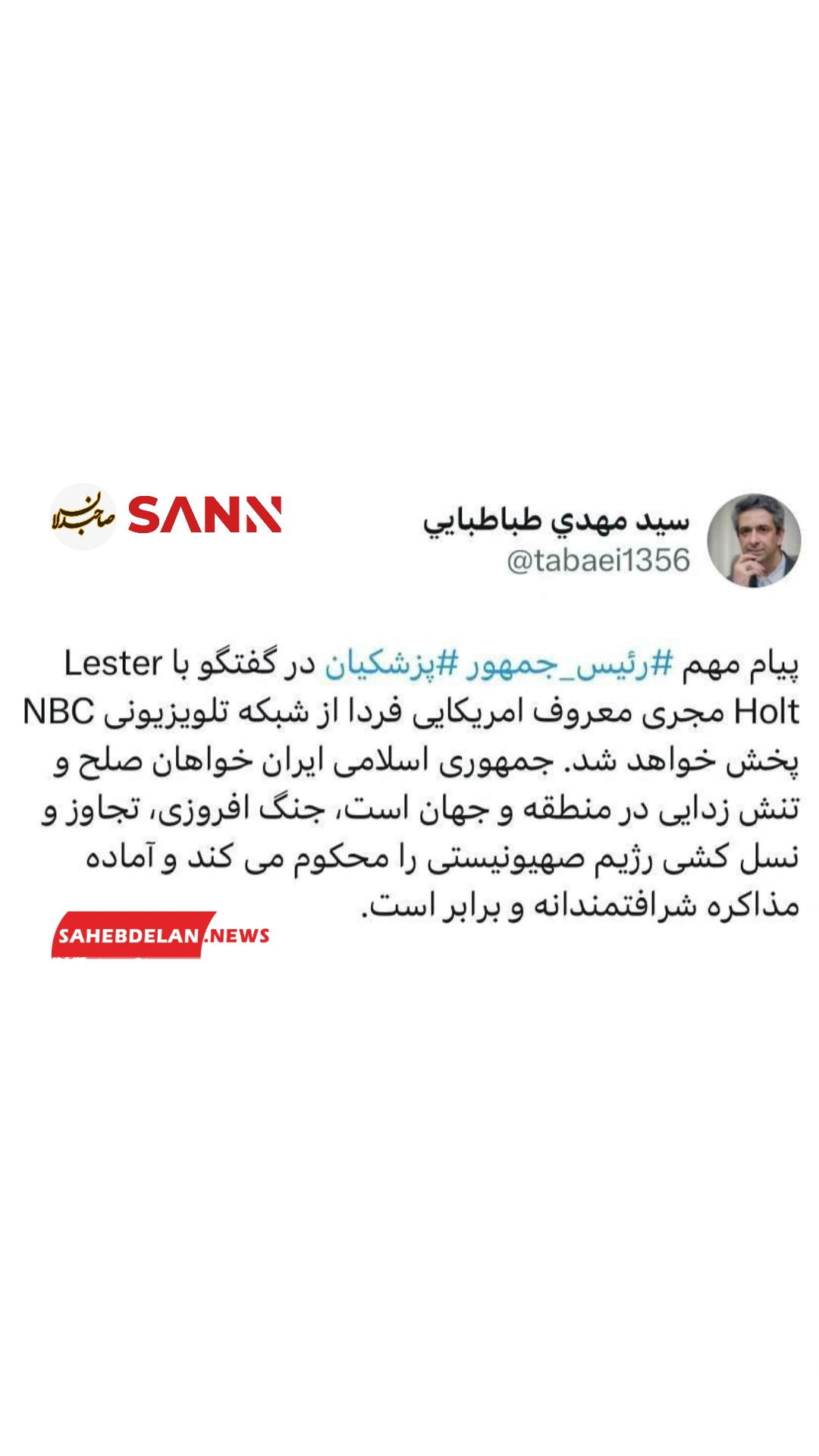 🔹پیام مهم رئیس جمهور پزشکیان در گفتگو با Lester Holt مجری معروف امریکایی فردا از شبکه تلویزیونی NBC پخش خواهد شد.