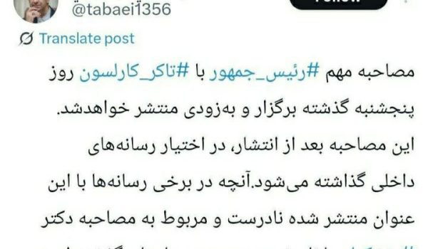 معاون ارتباطات و اطلاعرسانی دفتر پزشکیان:🔹مصاحبه مهم رئیسجمهور با تاکر کارلسون روز پنجشنبه گذشته برگزار و بهزودی منتشر خواهدشد. 🔹این مصاحبه بعد از انتشار، در اختیار رسانههای داخلی گذاشته میشود....