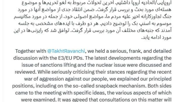 معاون وزیر خارجه ایران:🔹گفتوگوها با طرفهای اروپایی جدی، صریح و مفصل بود. 🔹آخرین تحولات مربوط به لغو تحریمها و موضوع هستهای مورد بحث و بررسی قرار گرفت. 🔹مواضع اصولی خود،...