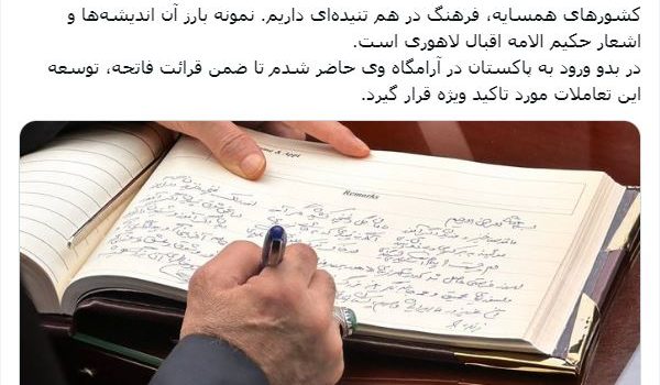 رئیس جمهور در شبکه ایکس:🔹برادری بین کشورهای اسلامی، فراتر از مناسبات سیاسی است. ما کشورهای همسایه، فرهنگ در هم تنیدهای داریم. 🔹نمونه بارز آن، اندیشهها و اشعار حکیم علامه اقبال...