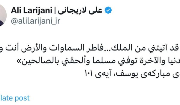🔹علی لاریجانی در اولین پیام خود بعد از انتصاب به عنوان دبیر شورای عالی امنیت ملی در شبکه اجتماعی ایکس، آیه ۱۰۱ سوره یوسف (ع) را منتشر کرد. 🔹این آیه...